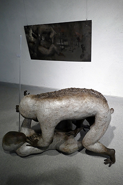 1999年の「不能」シリーズ。「船を手に入れる」「殺しあう」「子を育てる」「呼び声をあげる」。猿たちは一様に火傷を負い、顔は黒く焦げている。まずは、大作「船を手に入れる」。5mはあろうかという土の船に、目はつぶれ背中は焦げた一匹の猿がかがんで乗っている。