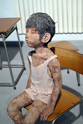 2018年の「緊急避難」。人間の子供と猿、さらに右半分猿、左半分が人間の3体が小学校の机と椅子に座っている。人間の子供はうつろなまなざし。
