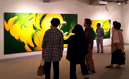 現代美術の抽象絵画だが装飾性がある。装飾性、美は現代美術が失ってしまったものの一つ。これはかつての日本画と洋画のいいとこ取りである。横田さんがこうした新しい絵を描くために、いろいろと考えて工夫をした結果だ、と思う。工夫という知性がなければ新しい絵は描けない。