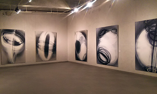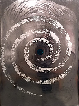 最も惹かれたのは、流れる銀河の中に眼のような円があり、近づいてさらに右に左に身体を動かし視点を移動させてみると、その都度生きた煌めきが感じられる、それはどうもダイヤモンドの粉を用いているらしいのだ。一つの視点から撮られる写真では引きだし得ない作品の輝き、少し離れてみるとまた顔が浮き出たような感も。作家の行為の軌跡に観る側もまた関わって対峙する、その鑑賞の姿勢にこそ応えてくれる絵画群だ。大作とは言えないにしろ、その銀河の流れのスケールと何重かの円による眼の煌めきこそ、その手法と作為を越えて生まれた表現の持つ偶有の美を感じさせる。