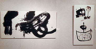 前者は墨がぼくっと塗られ、そこが切り裂かれ捲られている。後者は円形がいくつも描かれ、画面は丸く白く切り取られている。一見切る、切り取るという行為が、見る側にちょっと怖いような意外性を与えるが、すぐにユーモラスに溶け込み、作者の楽しみの感覚が伝わってくる。切り裂き画面といえば、かのフォンタナが連想されるが、墨の画にこうして切り裂き、裏地もある、新しい空間を模索する作者の前衛性が若々しい。