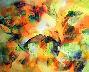 画面は抽象的でオレンジ、黒、緑が混ざり合っているが、オレンジがもっとも満ちていて、心の前向きな明るさが感じられる。
