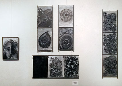「untitle」(熊倉伸代) 今回は灰色の画面から、目の様な円形が出現して来た。それが増え、やがて連結されたそれらの画面もある。精神と肉体の狭間のある種苦痛から生まれてきたような形には、結果としての存在の〈たしかさ〉が感じられる。左端に自画像があり、それはアウンサン・スーチーに似ていると、小生を含めた何人かの方の共通見解になった。