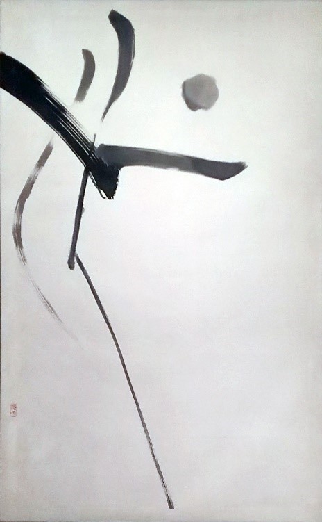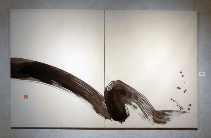 出来上がってそして歳月を経た画は、その迫力を秘めながらドイツの地に融和していこうとする感覚も伝わる。1978年当時、ソニーの社長であった盛田昭夫とデュッセルドルフで出会い、この二作は購入されたのだが、日本的な墨の画の迫力と東洋の美の形を見せながら、欧州の空間に馴染む神秘的パフォーマンスとして身体的共感をもって受け止められたのだろう。
