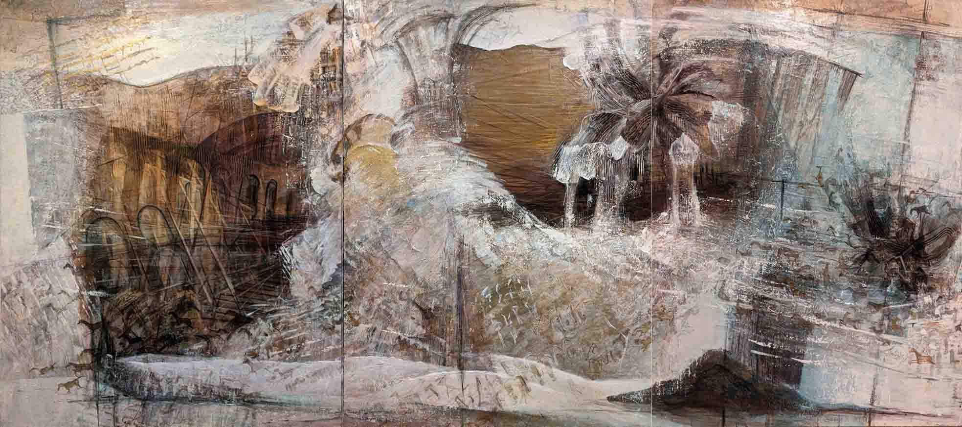 「覇者達の大移動・思い」は100号7枚、幅約9.1m、「BEYOND DESCRIPTION」は幅約5.4mの大作だ。前者は制作時期がずれている2作の合作となり題名は二つあるが覇者がテーマとなっているので一つの作品と考える。石造りのアーチの建築物が縦横に複合して描かれていることが目を引く。それらの建物は東洋と西洋のはざまのトルコあたりの建築物のイメージか。そして下半分には馬が走り回り、白い水が画面各所体に噴出している。左は凍結した景色だとも。描かれている建物のサイズも視点も意図的に複合しバラバラである。パノラマというか大きな屏風というか一点透視法ではない構図はかつての中世の洛中洛外図などの絵巻を彷彿とさせる。