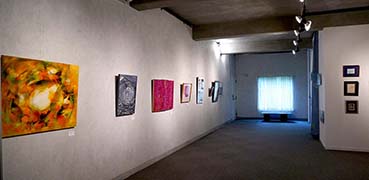 臼井由美子「Inventions 即興曲風の小品」 五作展示されている。繊細さと俯瞰的な要素とを併せ持つ抽象画。見ている内に、それを横から見ると風景画に見えるものが数点。作者に確かめると、まったく意図はなかったと。右下の作品は、右に首を傾け白い雪の平原に向こうは山と空のように感じられていた。しかしまた首を左に曲げると手前が大地で、地平線と白い空が見えてくる……不思議な面白さが感じられた。