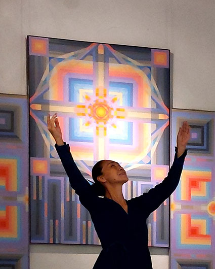 反対の壁には平松輝子「月光曼荼羅」が向かい合う。真言密教でいう「月輪観とは、心の中で月をイメージすること。月と自分が一体化し、宇宙とつながることでもある。
